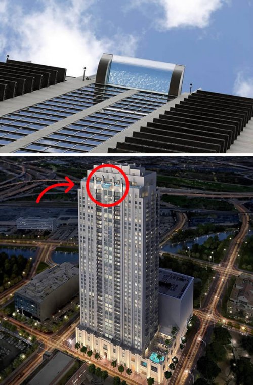 5. Новый роскошный жилой комплекс Market Square Tower в Хьюстоне, Техас, может похвастать бассейном со стеклянным дном, который находится на крыше и выступает за край небоскрёба. Пловцы могут смотреть вниз и наблюдать за уличной жизнью, просто гуляя по бассейну. "Небесный бассейн" (Sky Pool) выступает с крыши нового 42-этажного небоскрёба, нависая над улицей на высоте 152 метра.