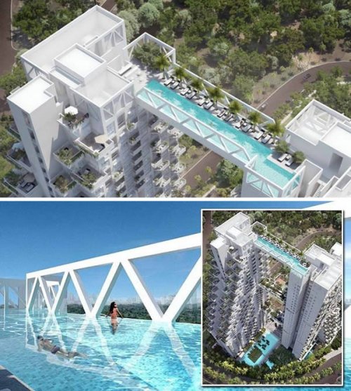 7. Этот 50-метровый "плавательный мост" между двумя башнями кондоминиума в Сингапуре является частью 574-квартирного 38-этажного небоскрёба Sky Habitat. Здание смешанного назначения спроектировано израильско-канадским архитектором Моше Сафди (Moshe Safdie). Оно может похвастать не только огромным бассейном у подножия небоскрёба, но и двумя "зелёными" переходами.