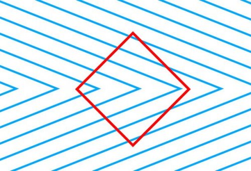 Это еще одна очень старая оптическая иллюзия, нарисованная американским психологом Орбисоном (Orbison) еще в 30-х годах 20 века. Красный ромб по центру – на самом деле идеальный квадрат, но из-за фоновых синих линий кажется, что он немного искривлен или повернут.