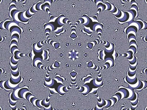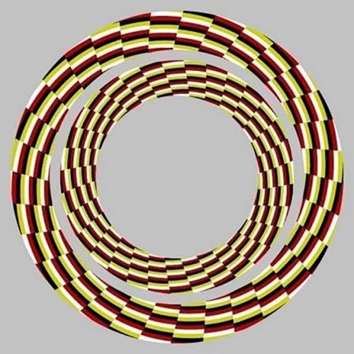 Кому-то хватит и простого взгляда, чтобы сразу же заметить движение, а кому-то придется немного подождать. Но рано или поздно вам обязательно покажется, что круги на этой картинке вращаются. На самом деле это обычная картинка, и никакая не анимация, но наш мозг с трудом справляется с таким набором цветов и форм одновременно, и ему проще решить, что на экране что-то вращается.