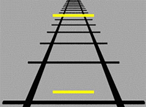 Хотите – верьте, хотите – нет, но на изображении нарисованы 2 абсолютно одинаковые по длине желтые линии. Обманчивая перспектива черных полос может сбить с толку, но советуем опять взяться за линейку.