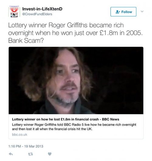 Дэвид Ли Эдвардс, бывший заключенный из Кентуки (Kentucky), выиграл 27 миллионов долларов из призового фонда лотереи Powerball и решил, что ему необходима помощь финансовых консультантов, чтобы правильно распорядиться невероятной суммой. Однако вместо того чтобы воспользоваться советами экспертов мужчина вместе со своей женой потратил все деньги на предметы роскоши и наркотики. Из-за пристрастия к наркотикам пара заразилась гепатитом, и 12 лет спустя на 58 году жизни Дэвид умер в хосписе. Финансовый советник мужчины утверждает, что если бы мистер Эдвардс послушался его, он бы мог зарабатывать по 85 000 долларов в месяц за счет грамотных инвестиций.