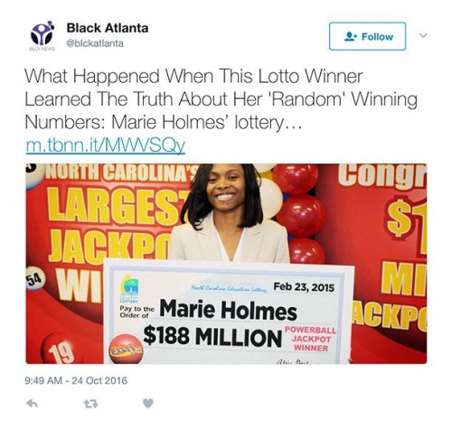 Мать 4 детей Мэри Холмс работала в супермаркете Wal-Mart, когда «случайные» цифры на лотерейном билетике обеспечили ей выигрыш в 188 миллионов долларов. Невероятная сумма стала 5 самым крупным выигрышем в истории лотереи США. Вскоре жизнь американки была разрушена чередой неправильных финансовых решений и судами – ее парня то и дело приходилось вытаскивать из тюрьмы, и только на судебные издержки и залоги официально ушел 21 миллион долларов. Все это тяжело сказалось на эмоциональном состоянии девушки и почти полностью опустошило ее карманы. А потом Мэри узнала, что цифры с ее билетика не были случайными. Билетик вообще оказался не ее. На самом деле лотерею выиграла мать женщины, но она тайком подкинула дочери выигрышный талончик, чтобы помочь Мэри в ее нелегкой судьбе.