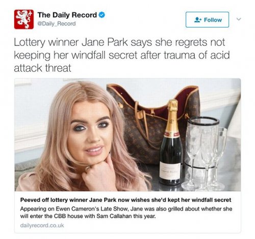 В 17 лет Джейн выиграла 1 миллион фунтов стерлингов (1 303 600 долларов), и первым делом она купила себе модную сумку от Louie Vuitton. Растраты на этом не закончились, и в итоге девушка довела себя до депрессии, потеряла смысл жизни и обвинила представителей лотерейной компании в том, что они разрушили ее жизнь. Однако корпорация утверждает, что выплаты по выигрышу производились в долгосрочном режиме, чтобы Парк могла с мудростью распорядиться своими деньгами, а значит, она сама виновата в неразумных растратах.