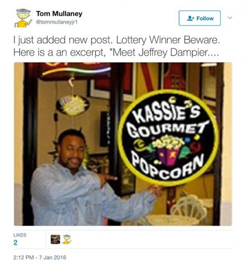 После невероятного выигрыша в лотерее (20 миллионов долларов) Джеффри начал свой собственный бизнес и основал компанию по приготовлению попкорна для гурманов. Он также надарил подарков своим родственникам, включая и свояченицу Викторию Джексон (Victoria Jackson), с которой у Джеффри была интрижка. В 2005 году Виктория и ее парень связали и ограбили Дампьера. Но этого оказалось недостаточно – во время налета парень мисс Джексон направил на нее пистолет и сказал: «Убей его, или я убью тебя». Виктории пришлось убить Джеффри выстрелом в затылок…