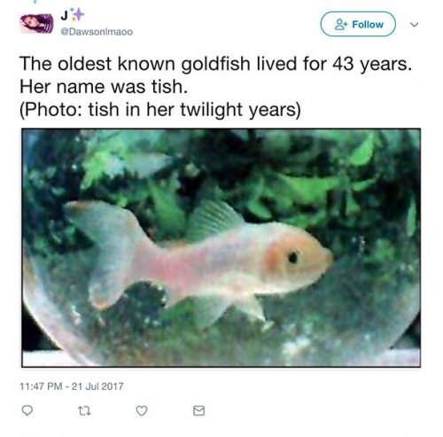 Самой старой в мире золотой рыбке было 43 года, и это даже было подтверждено комиссией Книги рекордов Гиннесса.