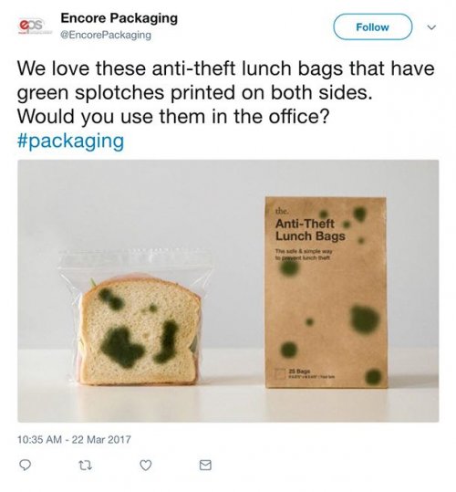 Офисы просто кишат ворами, мечтающими заполучить ваш восхитительный сэндвич с индейкой и беконом. Почему бы не сорвать их коварные планы используя специальные пакеты для ланча? Они заставят ваш ланч выглядеть так, словно сэндвич заплесневел, и вор поищет другой объект для кражи. Странно? Да. Эффективное? Абсолютно!