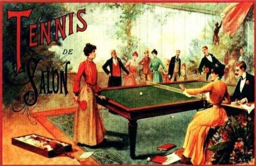 Пинг-понг начинался как миниатюризированный вариант тенниса, поскольку представители Викторианской эпохи среднего класса использовали свои обеденные столы в качестве миниатюрных теннисных кортов. «Сетку» сооружали из книг. Крышки от сигарных коробок были «ракетками», позднее их заменили на «пергаментную бумагу, натянутую на рамку». В качестве мячей служили различные предметы, в том числе шары из струн, пробки от шампанского и резиновые шарики.