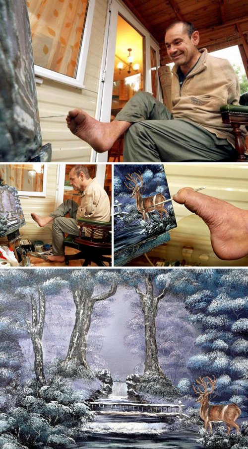 5. Питер Лонгстафф (Peter Longstaff) родился без рук из-за того, что во время беременности его мать принимала талидомид (снотворное лекарство с серьезными побочными эффектами). Однако Питер никогда не считал себя ущербным и всегда старается заражать окружающих позитивным настроем. Искусство стало его лучшим помощником в этой благородной миссии.