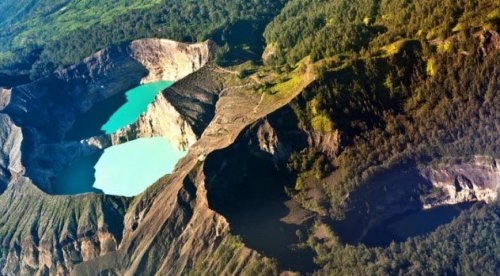 У подножия индонезийской горы Келимуту (Kelimutu) разлилось три кратерных озера, почитаемых среди местного населения как загадочные миры, в которые люди попадают после смерти. Неудивительно, что островитяне их боготворят, ведь выглядят эти озера, действительно, как неземные порталы. Кстати, свой цвет каждый из водоемов может поменять почти в любой момент, и индонезийцы верят, что таким образом вода отражает настроение духов предков.
