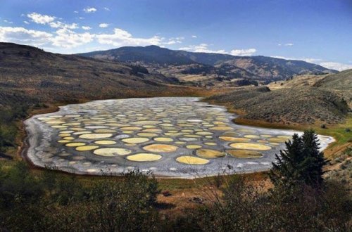 В Канаде есть одно очень необычное озеро. С виду оно напоминает детский рисунок или кожу пятнистой саламандры, и такое место прекрасно смотрелось бы на иллюстрациях к истории Льюиса Кэрролла про Алису из Страны чудес. Впрочем, оно существует в реальности, так что детские книги нам ни к чему. Пятнистое озеро Хилук (Khiluk) находится неподалеку от городка Осуюс (Osoyoos) в Британской Колумбии, и это очень необычный водоем, как вы уже могли догадаться. Поверхность озера покрыта гигантскими яркими пятнами, которые меняют свой цвет в зависимости от состава воды и времени года, окрашиваясь то в желтые, то в темно-синие оттенки.