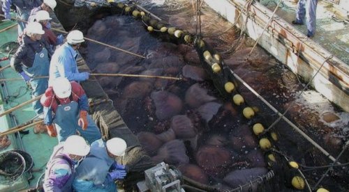 Медуза Nemopilema nomurai (она же медуза Номура) является одним из крупнейших видов медуз. Гигантское существо может весить до 204 килограммов и достигать в ширину 2 метров.