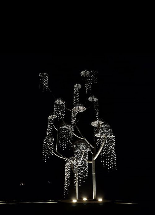 Скульптура высотой почти 11 метров (35 футов) установлена в центре крупной круговой транспортной развязки строящегося жилого комплекса и изготовлена из стальных шаров с зеркальной поверхностью.
