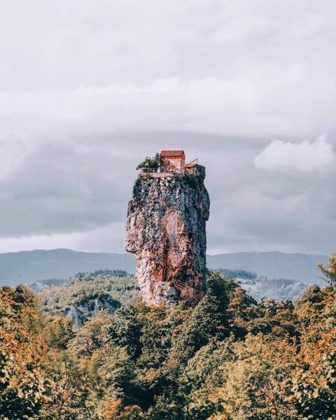 8. Такой дом – настоящий рай для интровертов. Как видите, он построен на верхушке неприступного скального утеса, находящегося где-то в горах Грузии. В доме уже почти 25 лет живет монах-отшельник, которому местные жители регулярно с помощью лебедки передают все необходимое, включая еду.