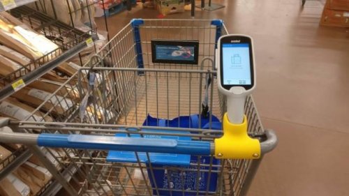 В этой магазинной тележке есть сканнер, который суммирует цены всех продуктов, которые в неё кладут.