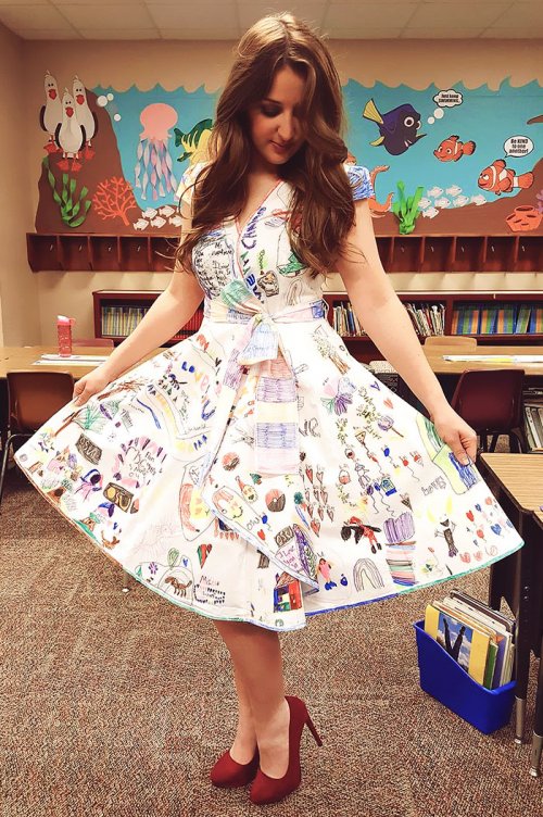 Именно так случилось с Хейли Кёрфман (Haley Curfman), учительницей 2-го класса в Блэквелле (Blackwell), штат Оклахома, США. Она купила красивое белое платье, принесла его в класс и попросила своих учеников разрисовать его.