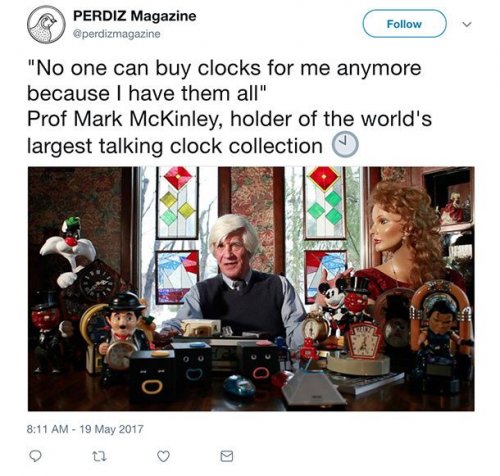 Все началось с покупки говорящих часов для его матери, поскольку она была слабовидящей. После этого он начал собирать говорящие часы. В конце концов, профессор Марк Маккиннли (Mark McKinnley) собрал 932 говорящих часов - самую большую коллекцию в мире. Можно подумать, что с таким количеством говорящих часов он уже мог бы стать кукушкой.