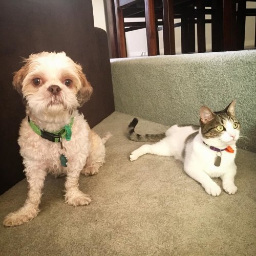 Четыре года назад Кейт стала ухаживать за трехногой кошечкой по имени Феникс (Phoenix). Когда пес встретил ее, то был на седьмом небе от счастья.