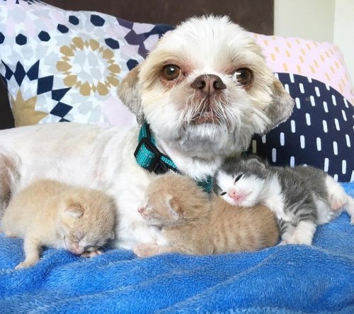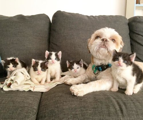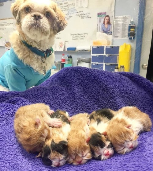 «Когда Мун услышит, что котята мяукают, он навострит уши и побежит, чтобы увидеть, где они находятся. Когда пес их находит, он обнюхивает котят и ложится рядом с ними. Он действительно любит своих детей», - говорит Кейт.
