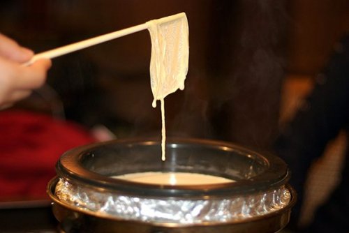 Юба похожа на тофу. Сначала соевое молоко кипятят, потом выпаривают и придают продукту вид тонкой кожи. Эта «кожа» называется юба, и как тофу, она не очень вкусная.