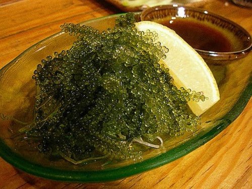 С японского название переводится как «морской виноград», а умибудо представляет собой водоросли, найденные в западной части Тихого океана от Вьетнама до Окинавы. Они выглядят как крошечные зеленые пузыри, которые лопаются, когда их раскусывают, и выпускают в рот соленую жидкость.