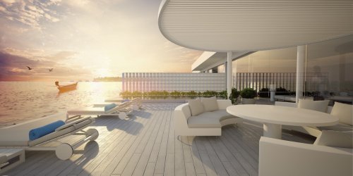 Над водой, куда ведёт винтовая лестница, будет расположено много комфортных зон с роскошной мебелью, в том числе ещё одна спальня, ванная комната, дамская комната, тренажёрный зал, помещение для дворецкого, помещение для охраны, вторая гостиная, кухня, бар и терраса, откуда можно наслаждаться прекрасными видами.