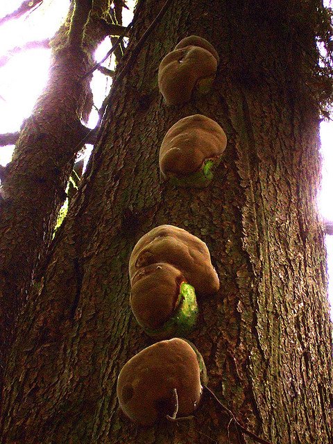 Как вы уже поняли, галлы образуются вокруг осиных яйцекладок. Однако эти наросты появляются не только при участии крылатых насекомых или клещей. Например, на следующем снимке перед вами ствол тсуги, покрытый грибами вида Phellinus punctatusa. Кстати, эти наросты на самом деле размером с кошку!