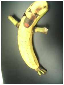 Кому-то стало скучно и он решил приколоться над бананами. Из одного банана он сделал акулу, а из другого - смешного человечка.