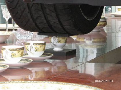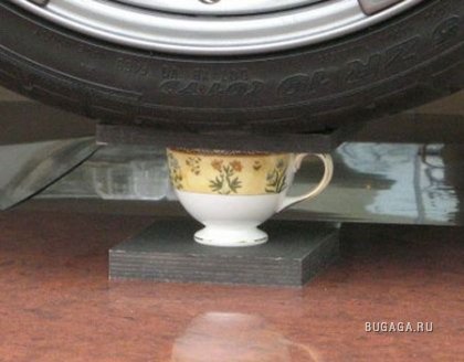 Необычной рекламной акцией решил привлечь к себе внимание известный в Северной Америке магазин китайского фарфора и сувениров William Ashley. 1430-килограммовый итальянский суперкар Lamborghini Gallardo подняли в воздух краном и аккуратно опустили колесами на оказавшиеся весьма стойкими 4 чашки из китайского фарфора.