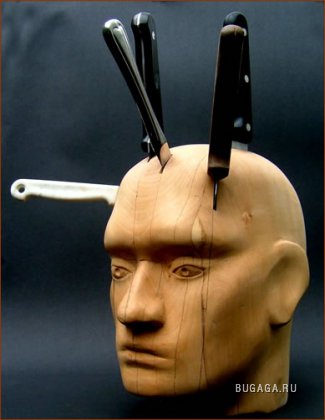 1 Жесткий брутальный дизайн для разочаровавшихся в жизни домохозяек предлагают нидерландские художники. Деревянная голова как подставка для ножей, может быть, и выглядит чересчур жестоко, но зато гости точно не останутся равнодушными
