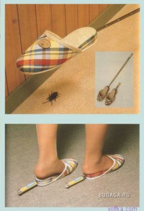 Теперь вы можете давить тараканов любимыми домашними тапочками даже с противоположного конца комнаты. Телескопические ручки в тапках выдвигаются на большое расстояние.