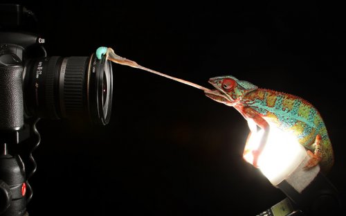Хамелеон найдёт свою добычу даже на объективе фотокамеры.