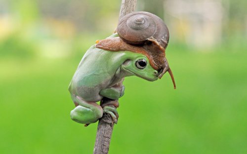Вот и познакомились. Улитка взобралась на голову лягушки и поняла, что там ей очень удобно.