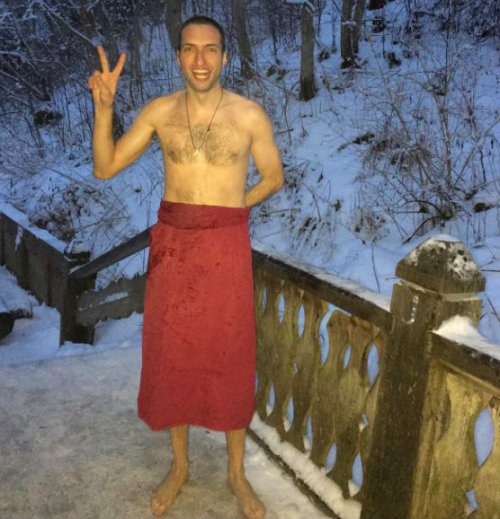 Сара (США): Прекрасный чистый снег. Вокруг природа. Это освежающее чувство, когда ты голый стоишь зимой на улице! И еще, может быть, алкоголь? Может, он выпил. Пьяные люди — счастливые люди.