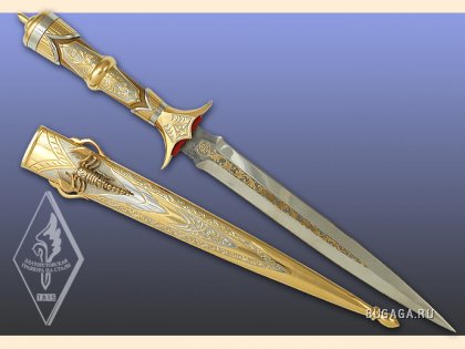 Авторская работа, сделанная в единственном экземпляре. Общая длина: 500 мм. Клинок кинжала кавказского - стальной, обоюдострый с боевым концом копьевидной формы, с тремя долами. Рукоять кинжала - цельно металическая, с гравировкой. Ножны кинжала тоже цельнометалические. Гравировка преймущественно с применением растительного орнамента. На ножнах кинжала использованны полудрагоценные камни. Технология: воронение, травление и золочение.