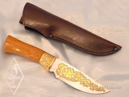 Нож охотничий золоченный. Общая длина: 350 мм. Клинок ножа стальной, из Златоустовкой углеродистой легированной стали, бездольный и полуторасторонним лезвием. Клинок ножа украшен позолоченной гравировкой. Рукоять ножа деревянная. Вверху и внизу на рукояти ножа имеются две металические гравированные втулки-головки, верхняя втулка с наконечником в виде шарика. Ножны охотничьего ножа деревянные с металическим гравированным прибором состоящим из устья и наконечника. Прибор ножен гравирован и позолочен, применено чернение.