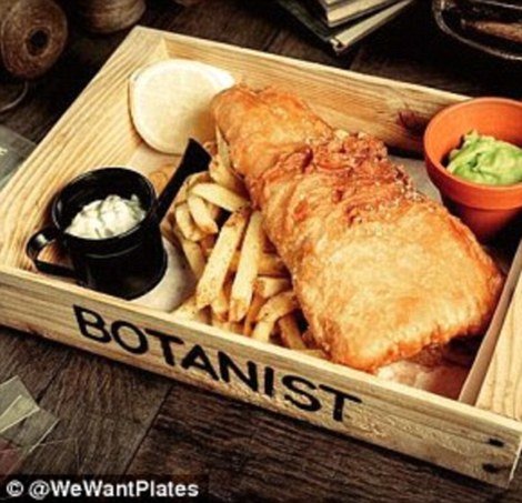 Жареная рыба и картошка-фри — в деревянном ящике, горох — в миниатюрном цветочном горшке, соус тартар — в миниатюрной садовой лейке