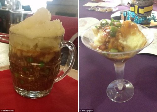 Картофельное пюре с мясной подливкой, поданное в кружке пива и бокале для мартини