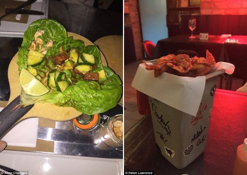 Салат, поданный на ракетке для настольного тенниса, и чипсы — в миниатюрной мусорной корзине