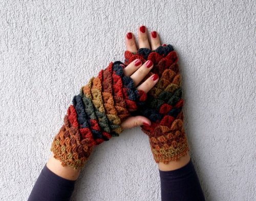 Кажется, этой зимой на улицах появится много "дракончиков"! Разноцветные вязаные крючком митенки, имитирующие кожу крокодила (или рыбью чешую?), выглядят как минимум необычно.