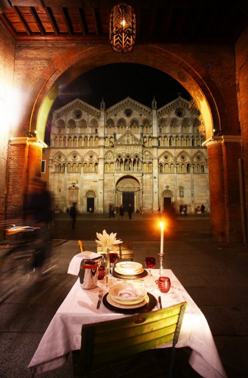 Этот таинственный и романтичный ресторан под названием Street Dinners был открыт год назад в Ферраре, Италия. Желающие поужинать в этом местечке должны приобрести специальный билет, где будет указан их заказ и количество мест, а также указать свой номер телефона. Место, где будет проводиться ужин, до последнего момента держат в тайне и лишь за несколько часов до начала рассылают смс сообщения о точном местоположении. Этот свежий подход в последнее время набирает большую популярность. Ужины обычно проходят в самых живописных местах и включают в себя музыкальное сопровождение и дополнительные развлечения.