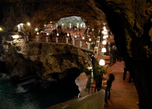 Этот ресторан, расположенный на юге Италии, открыт лишь в летние месяцы. Его посетители могут сполна насладиться захватывающими видами, открывающимися на Адриатическое море из недр известняковой пещеры.