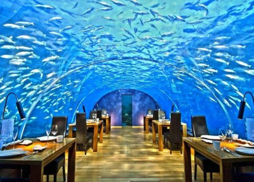 Это место по праву названо самым красивым рестораном в мире. Расположенный на глубине 5 метров от поверхности моря, ресторан Итха покажет вам всю прелесть вод, омывающих Мальдивские острова. Стены и потолок главного зала выполнены из стекла, что позволяет наслаждаться панорамным видом, раскрывающимся на оживленные воды океана. Пока вы ужинаете, коралловые рифы, стайки рыб, акулы и другие морские обитатели будут наблюдать за вами. Этот эксклюзивный ресторан предлагает обеды и ужины из блюд современной европейской кухни, включающие в себя деликатесные блюда из омаров и икры.