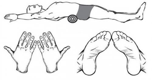 2. Положите валик на твёрдую горизонтальную поверхность (пол, кушетку и т.д.). Лягте на него так, чтобы он оказался поперёк вашего тела прямо под поясницей – под пупком. Это очень важно.