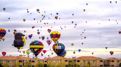 С помощью приложения для съёмки ускоренного видео, он запечатлел зрелищный вид десятков воздушных шаров, отправляющихся в полёт, поднимающихся в воздух и парящих над крышами домов, деревьями и дорогами города.