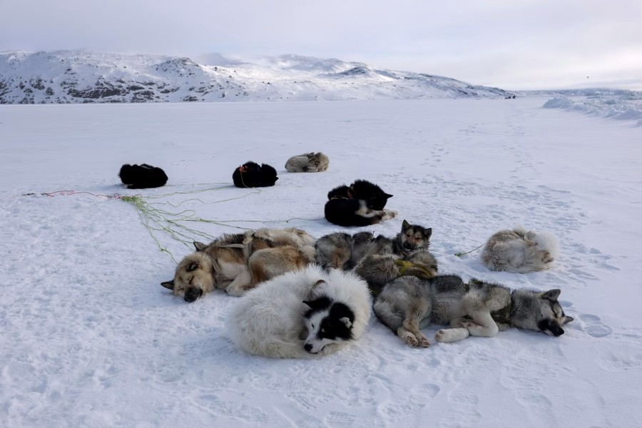 2. Ездовые собаки ждут своих хозяев, пока те ловят рыбу на льду в Илулиссате, 7 марта 2025 года. (фото: Джо Рэдл / Getty)