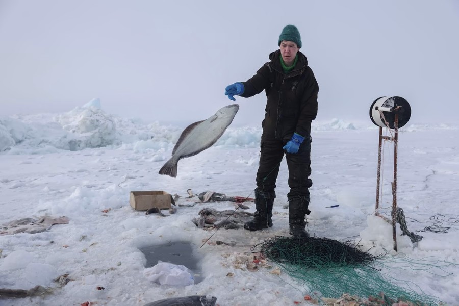 3. Ник Нильсен вытаскивает палтуса из лунки, 7 марта 2025 года. (фото: Джо Рэдл / Getty)