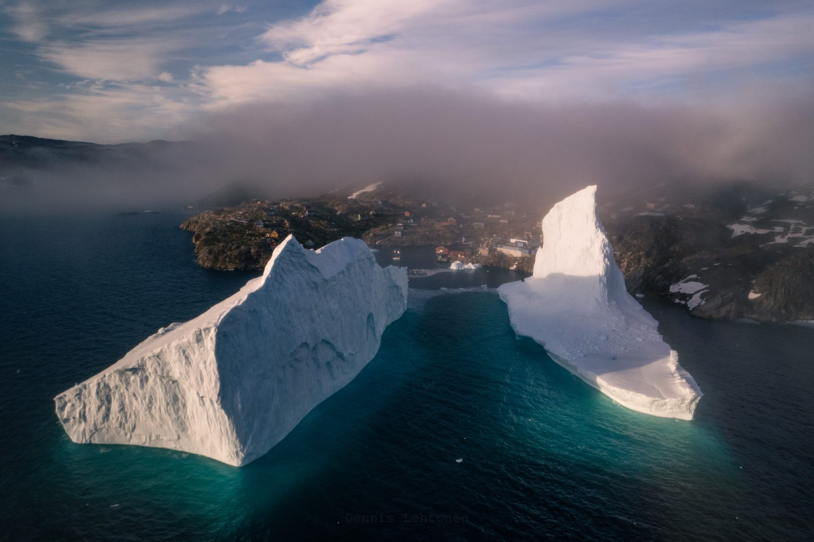 Когда Деннис приехал в Инаарсуит, он услышал об инциденте, случившемся здесь в 2018 году. Тогда деревню, где проживает около 160 инуитов, полностью эвакуировали из-за гигантского айсберга, подошедшего слишком близко к берегу. Его высота, по оценкам, составляла около 100 метров, и обрушение даже небольшой части могло вызвать волны, способные накрыть прибрежные дома. Несмотря на тревожность ситуации, она производила сильное визуальное впечатление. Лехтонен признаётся, что не мог не задаться вопросом: «А каково это — видеть у себя во дворе небоскрёб изо льда?»