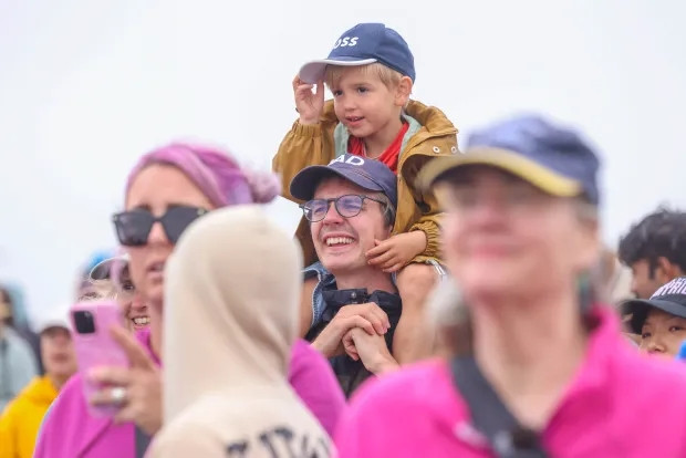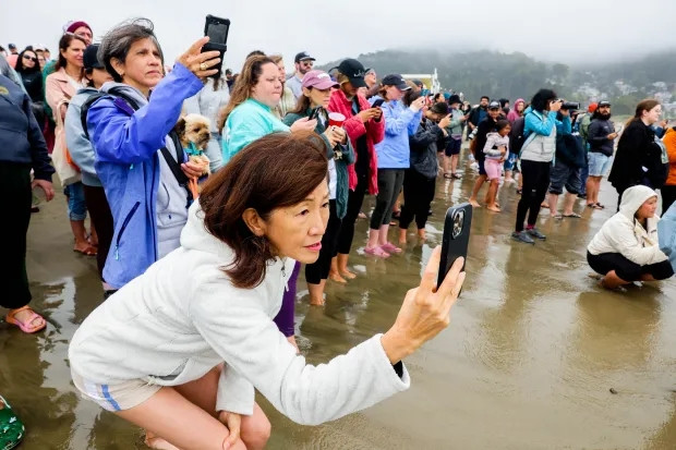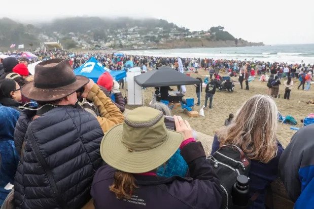 10. Сотни зрителей наблюдают за собаками, занимающимися сёрфингом, во время ежегодного чемпионата мира по сёрфингу среди собак на пляже Линда Мар в Пасифике, Калифорния, в субботу, 2 августа 2025 года