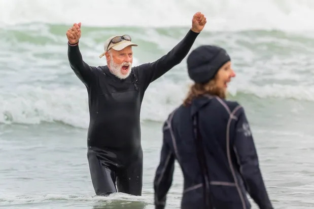 13. Дональд Хорн из Стинсон-Бич (слева) празднует победу своего 11-месячного пса Сэмми-младшего, который проплыл весь путь до пляжа в забеге для собак небольшого размера во время ежегодного чемпионата мира по сёрфингу среди собак на пляже Линда-Мар в Пасифике, Калифорния, в субботу, 2 августа 2025 года